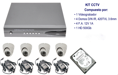 KIT video vigilancia completo, compuesto de: 4 cámaras, 1 Grabador 500 Gb, 50mt Cable para instalación, conectores de montaje para todo el equipamiento, asesoramiento para su sistema seguridad si desea usted mismo realizar el montaje le facilitamos manual de instalación y puesta a punto de su sistema de seguridad y le damos garantía de un año en todos los equipos. Todo el material es nuevo con su embalaje y garantía. Precio .– 385.-€
