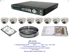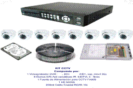 KIT video vigilancia completo, compuesto de: 8 cámaras interior 540 líneas día/Noche, Grabador 500 Gb, 200 mt Cable para instalación, conectores de montaje para todo el equipamiento.