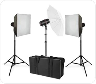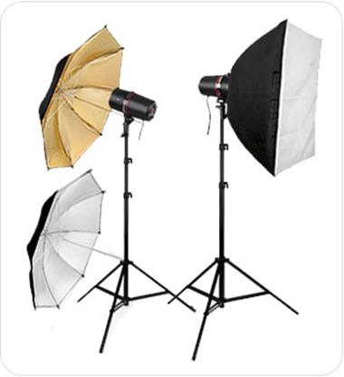 Kit Profesional completo para fotografía, dos focos iluminación 160 W, con sus trípodes y pantallas. Con intensidades de 160 w/seg, con temperatura de color de 5600 K y potencia de salida variable. Con el Kit de Iniciación recibirá dos Paraguas Reflector de 84cm (33 ), uno de tono Negro-Dorado con el que podrá obtener una iluminación clara, con potentes contrastes y colores brillantes, y otro Negro-Plateado con el que conseguirá un tono de luz blanco, claro y suave. Precio. 395.-€.